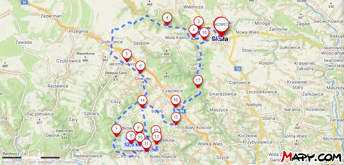 Parking przy Orliku w Skale - Grodzisko – Wielmoża- Pieskowa Skała - Gotkowice - Jerzmanowice - Będkowice - Kobylany - Karniowice - Bębło - Wierzchowie - Biały Kościół - Ojców - Wola Kalinowska - Parking przy Orliku w Skale
